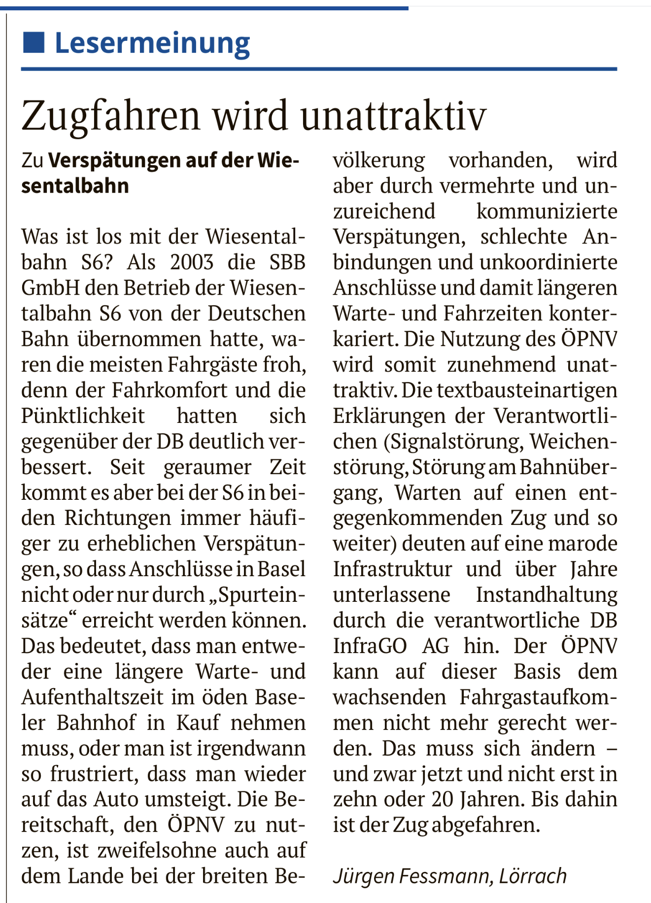 DO/OV v. 12.12.2025 Jürgen Fessmann: Zufahren wird unattraktiv: Verspätungen auf der Wiesentalbahn