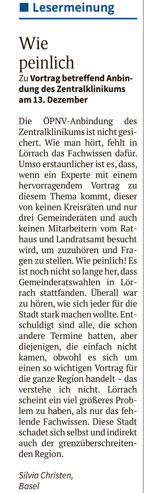 DO/OV v. 24.12.2024 Silvia Christen (CH): Vortrag betreffend Anbindung Zentralklinikum: Wie peinlich!