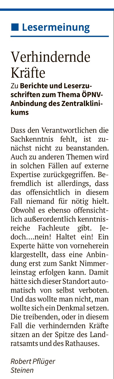DO/OV v. 28.12.2024 Robert Pflüger: Berichte und Leserzuschriften zur Anbindung Zentralklinikum: Verhindernde Kräfte