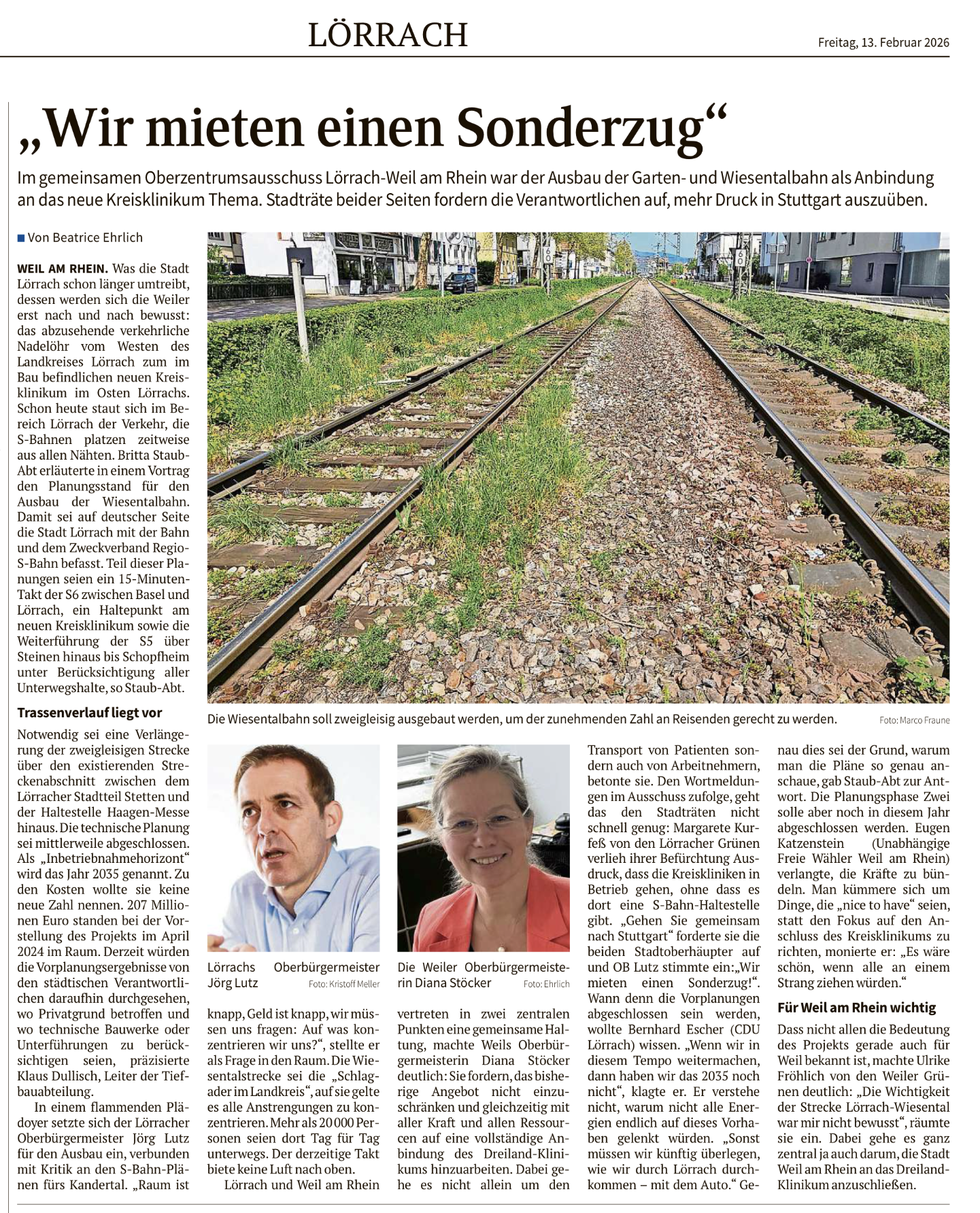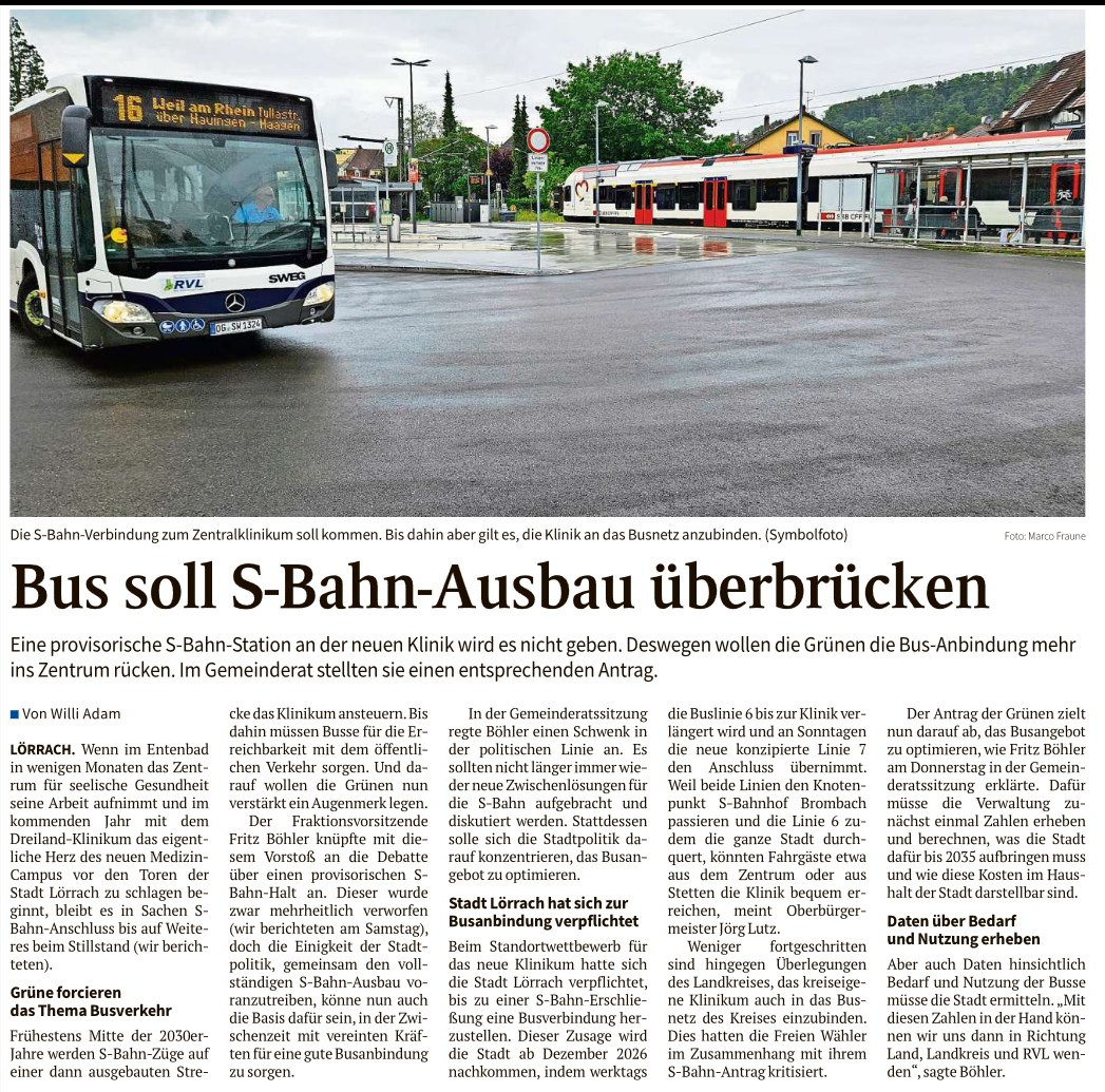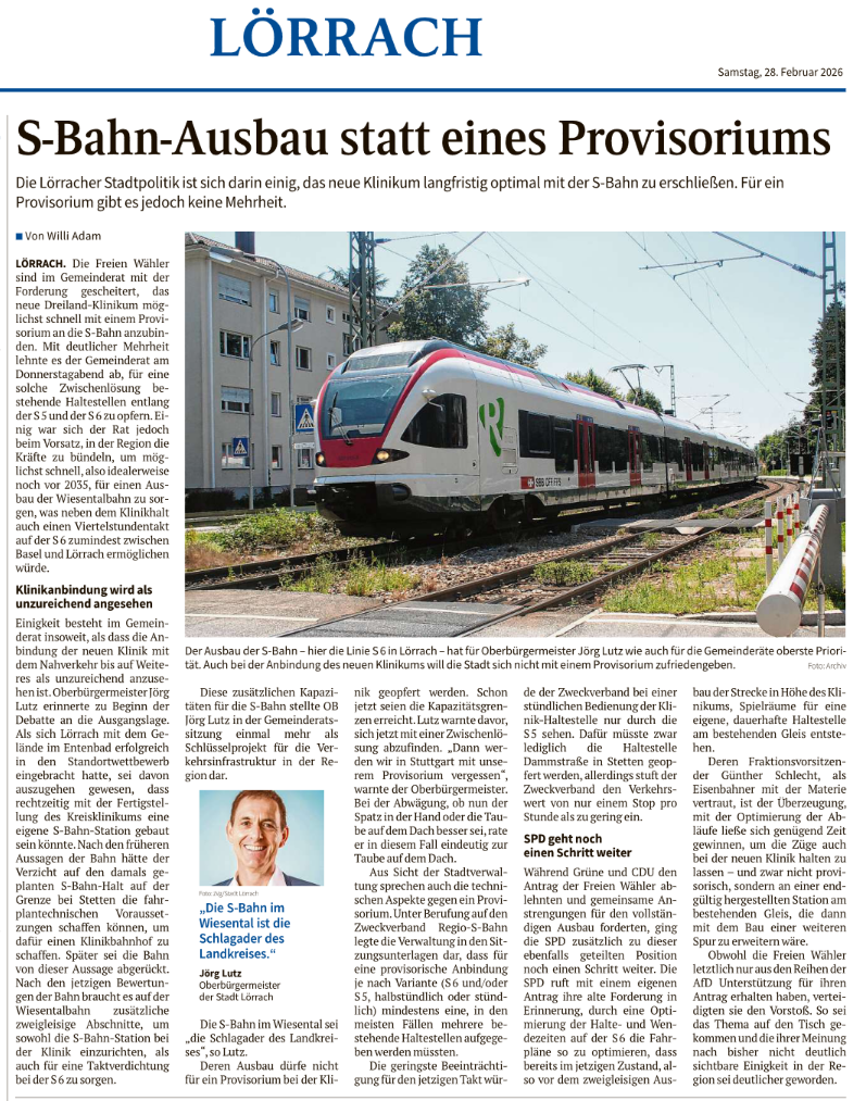 Die Oberbadische 28.02.2026: Die Lörracher Stadtpolitik ist sich einig: S-Bahn-Ausbau statt eines Provisoriums