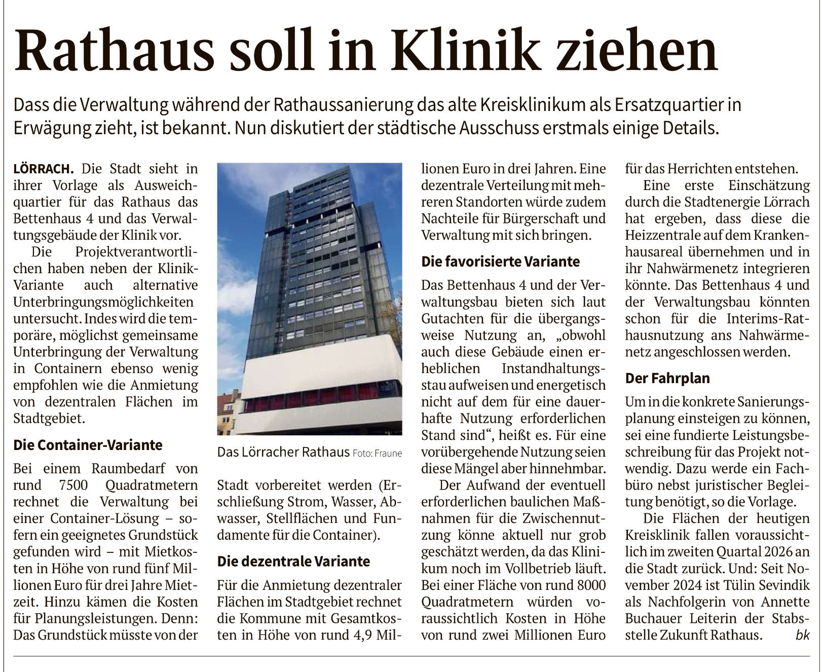 Die Oberbadische 02.04.2025: Altes Kreisklinikum als Ersatzquartier während Rathaussanierung: Ausschuss diskutiert Details