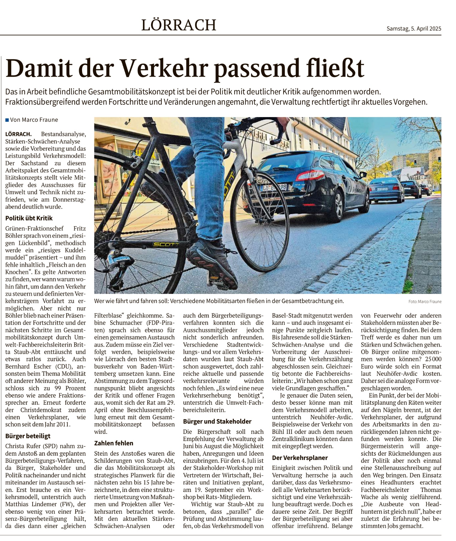 Die Oberbadische 05.04.2025: In Arbeit befindliche Gesamtmobilitätskonzept mit deutlicher Kritik: Damit der Verkehr passend fließt