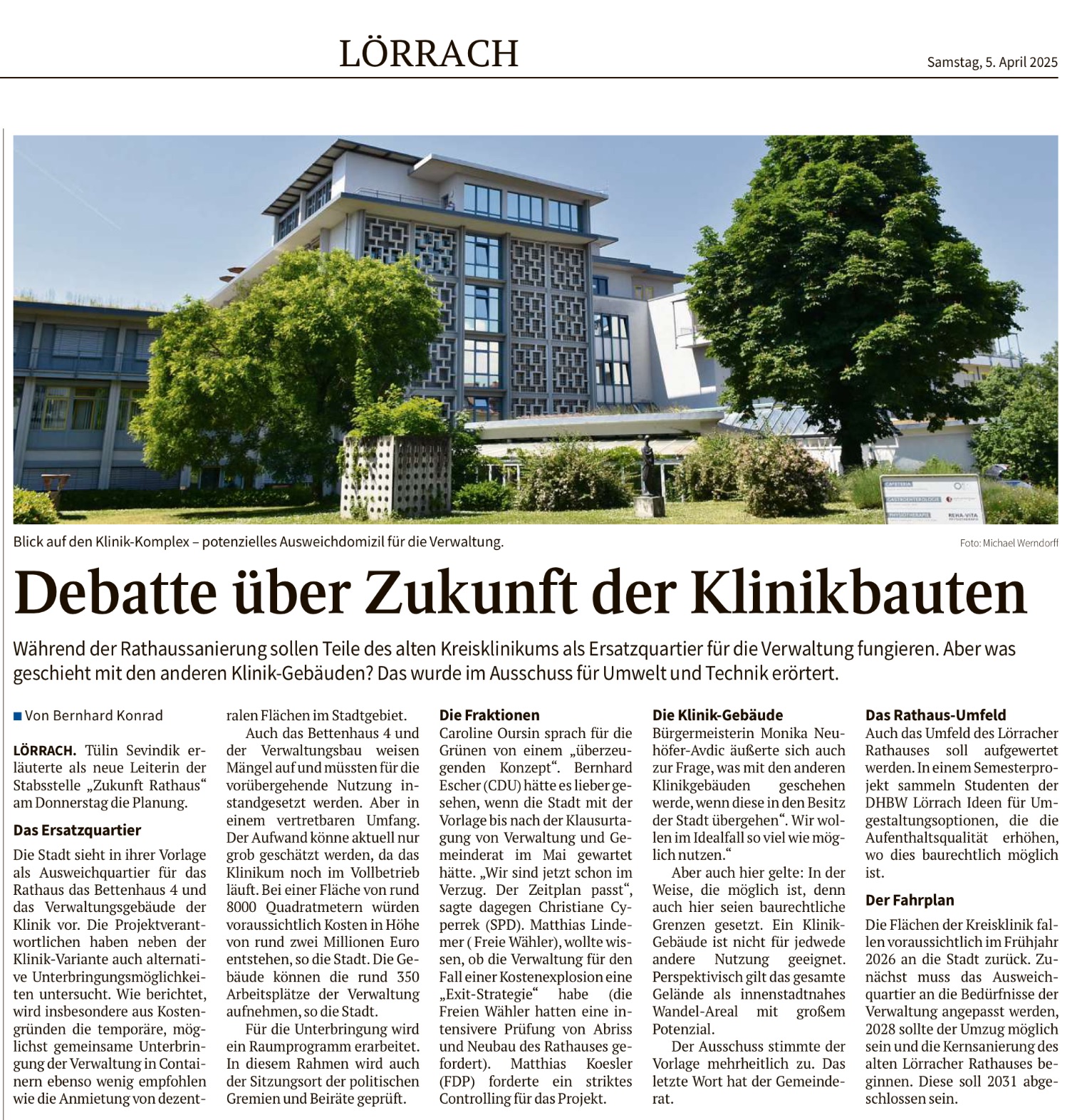Die Oberbadische 05.04.2025: Kreisklinikum als Ersatzquartier während Rathaussanierung: Debatte über Zukunft der Klinikbauten