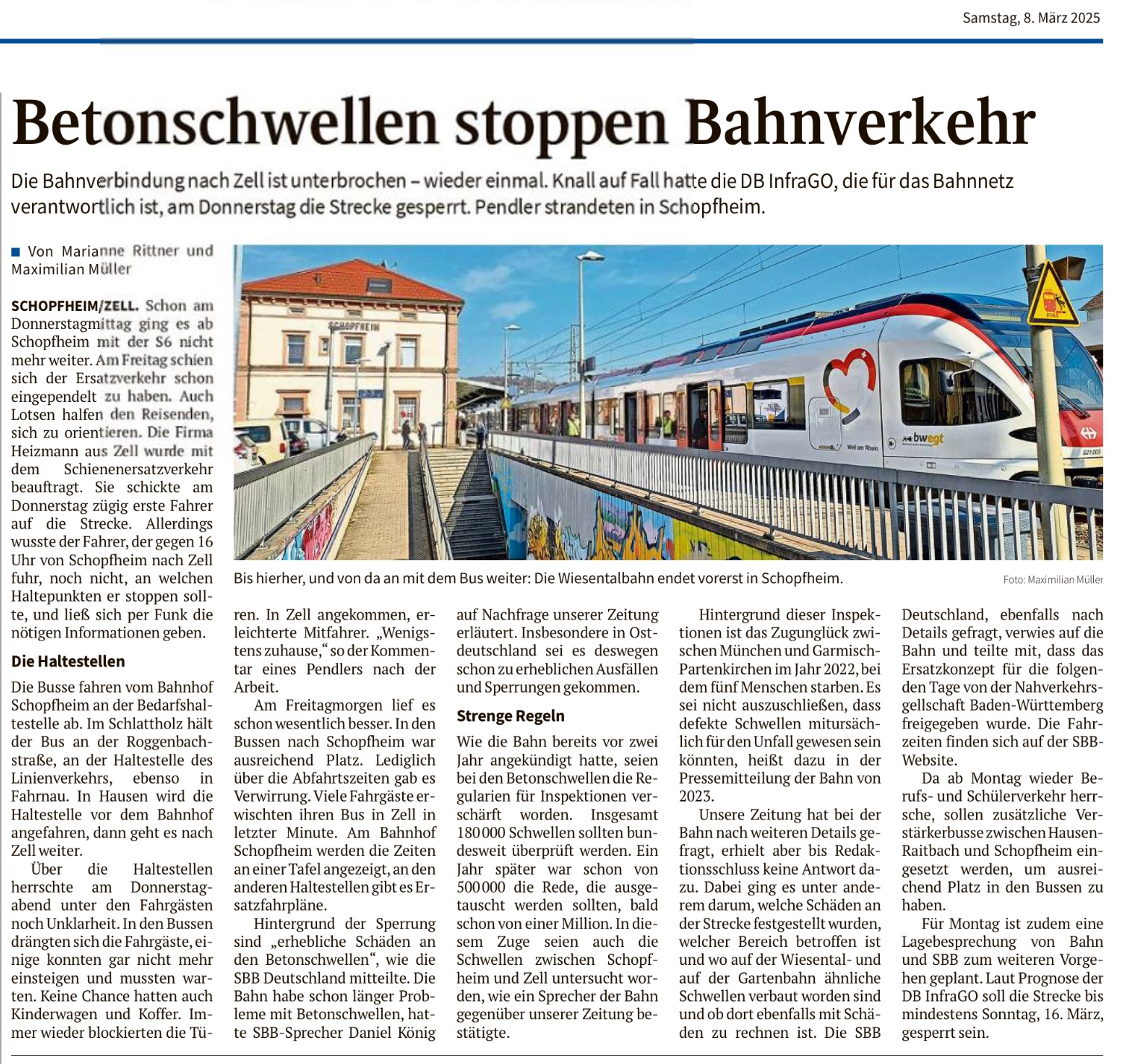 Die Oberbadische 08.03.2025: Bahnverbindung nach Zell unterbrochen: Betonschwellen stoppen Bahnverkehr