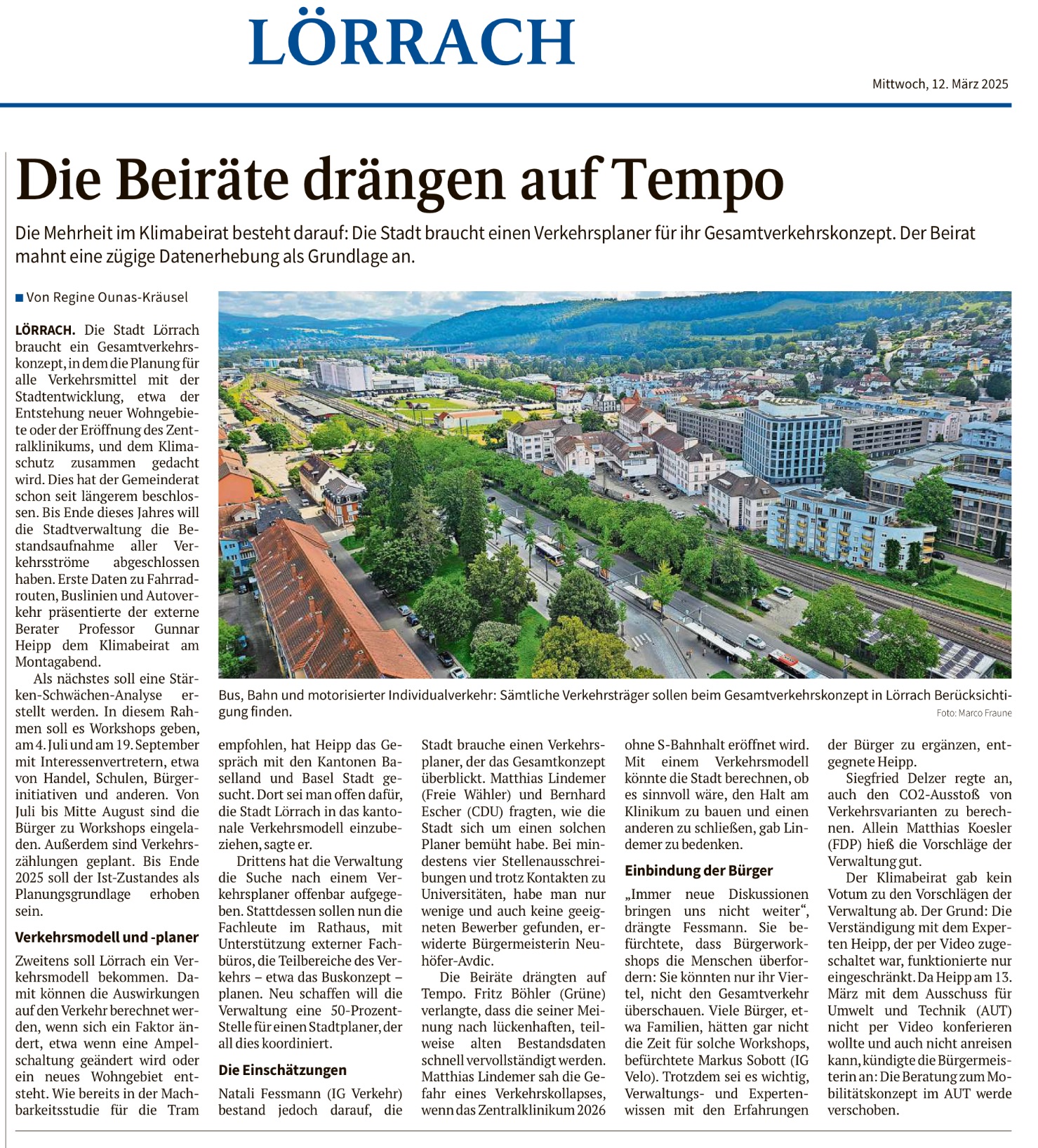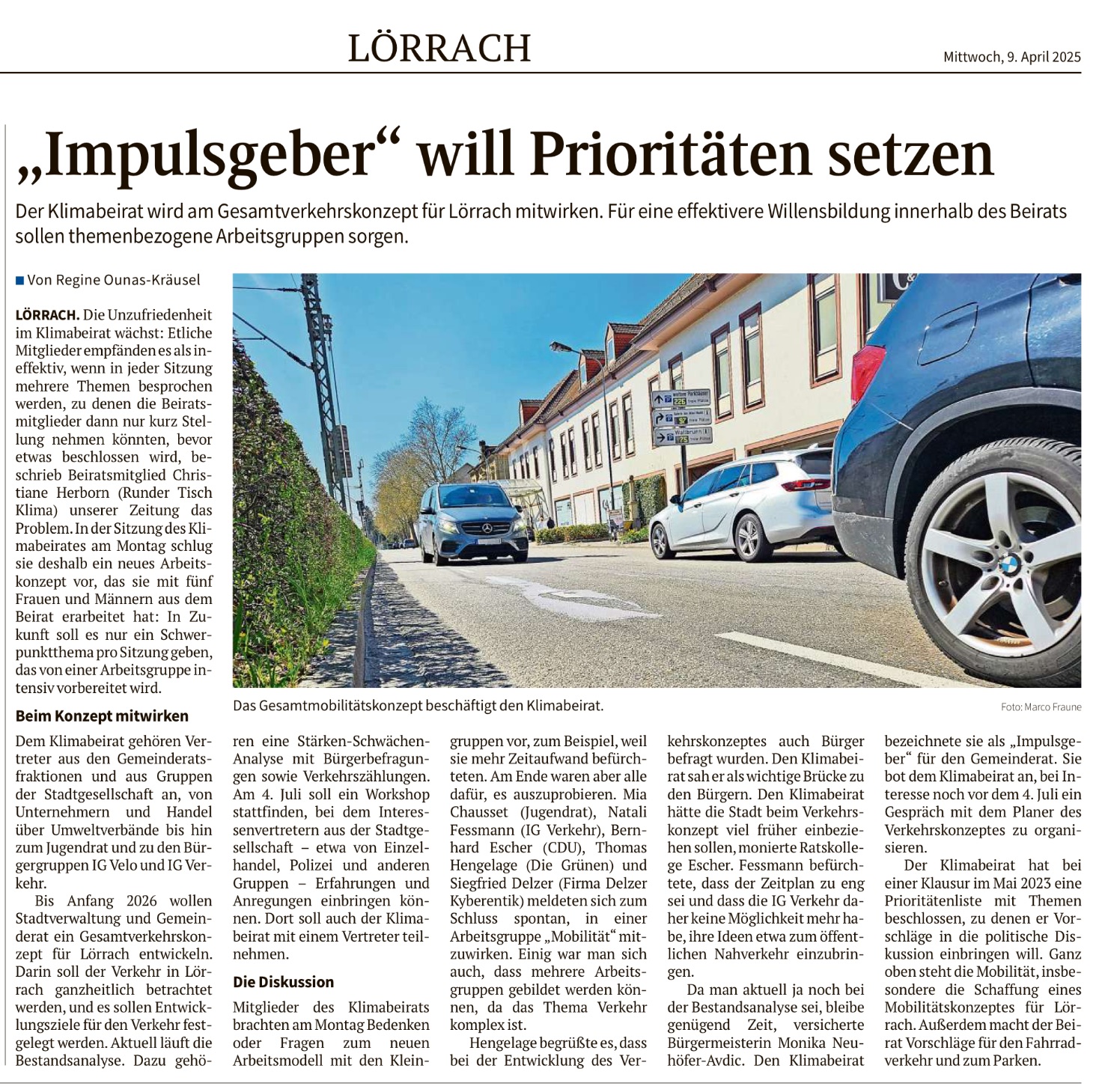 Die Oberbadische 09.04.2025: Der Klimabeirat wird am Gesamtverkehrskonzept für Lörrach mitwirken: "Impulsgeber" will Prioritäten setzen