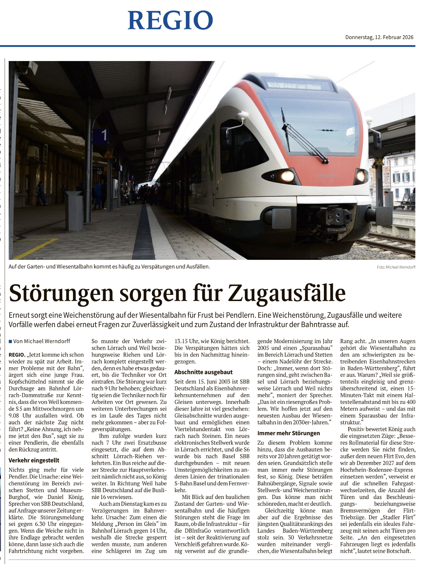 Die Oberbadische 12.02.2026: Erneut Weichenstörung auf der Wiesentalbahn: Störungen sorgen für Zugausfälle