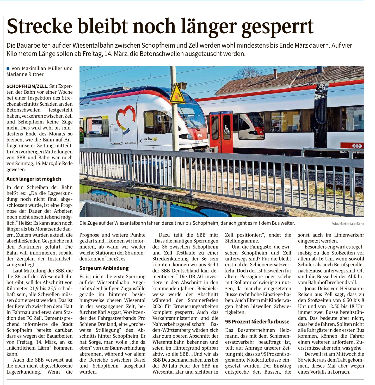 Die Oberbadische 13.03.2025: Bauarbeiten auf der Wiesentalbahn: Strecke bleibt noch länger gesperrt