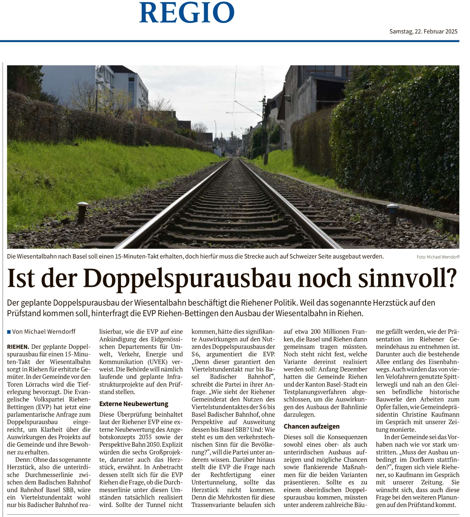 Riehener Zeitung (CH)) 20.12.2024: EVP Riehen zum Doppelspurausbau der S-Bahnlinie 6: Gemeinsam für nachhaltige Mobilität