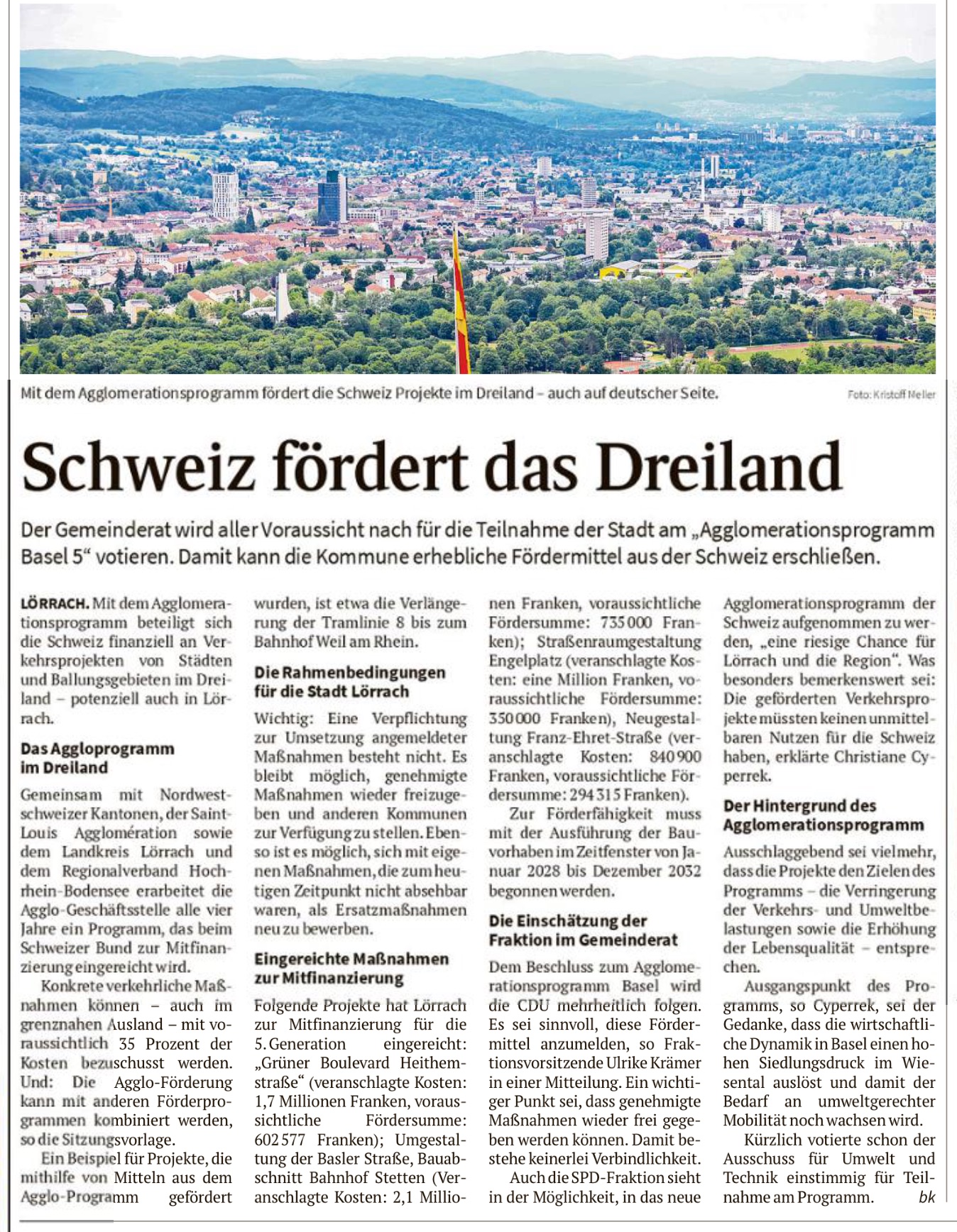 Die Oberbadische 26.03.2025: Agglomerationsprogramm Basel: Schweiz fördert das Dreiland