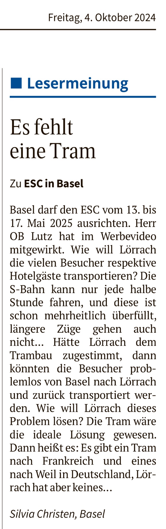 DO/OV v. 23.10.2024 Karlheiz Breuer: ESC in Basel: "Es fehlt eine Tram"