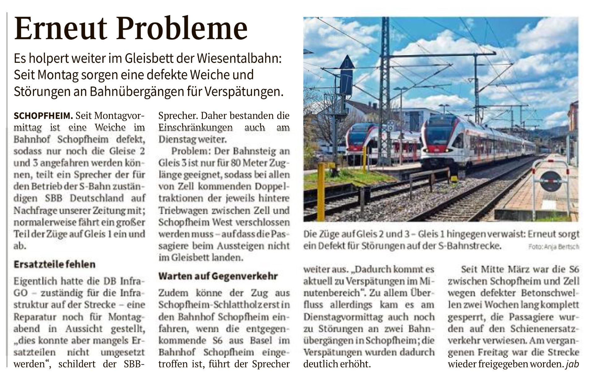 Die Oberbadische 02.04.2025: Es holpert weiter im Gleisbett der Wiesentalbahn: Erneut Probleme