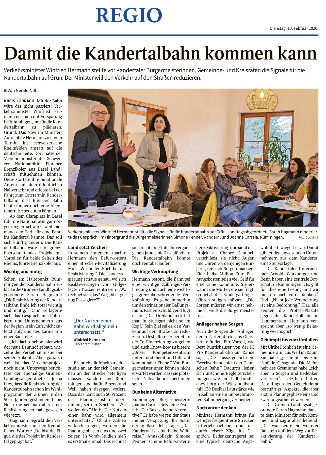 Die Oberbadische 10.02.2026: Verkehrsminister Hermann stellt die Signale auf grün: Damit die Kandertalbahn kommen kann