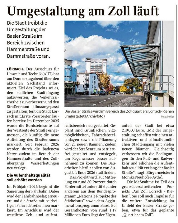 Die Oberbadische 14.03.2026: Basler Straße im Bereich Zollquartiers Lörrach-Riehen: Umgestaltung am Zoll läuft