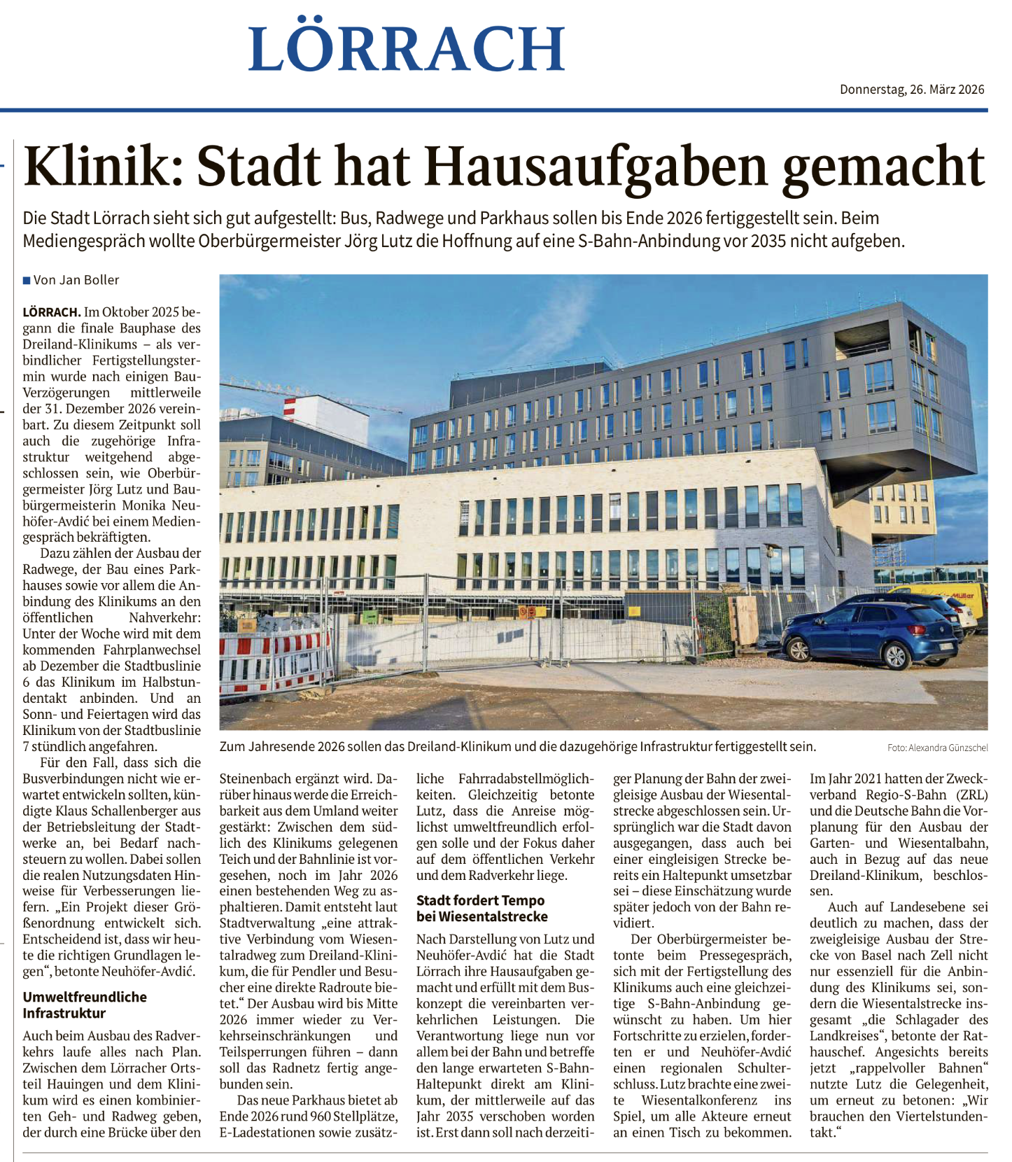 Die Oberbadische 26.03.2026: Klinik: Bus, Radwege, Parkhaus bis Ende 2026 fertig: "Stadt hat Hausaufgaben gemacht"
