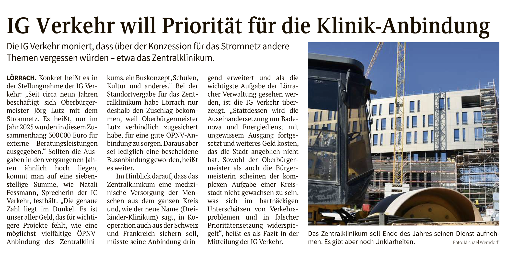 IG Verkehr Lörrach 18.02.2026: IGVL moniert, dass .... andere Themen vergessen würden: IG Verkehr will Priorität für die Klinik-Anbindung