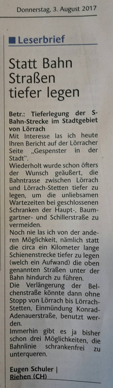 OV. v. 3.8.2017 E.Schuler: Statt Bahn, Straßen tiefer legen