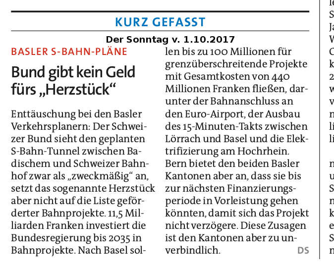 IG Pro Bahn CH 29.9.2017 CH-Bundesrat hat am 28.9.2017 entschieden: "...das Herzstück der Regio-S-Bahn nicht in die Bahninfrastruktur-Ausbauetappe 2030/35 aufzunehmen"
