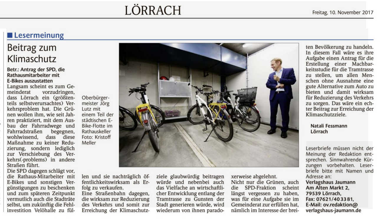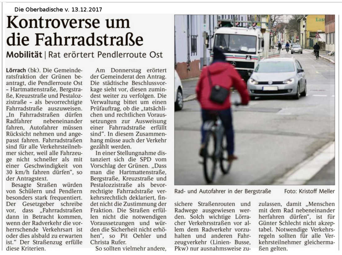 Die Oberbadische 12.12.2017: GRÜNE wollen Fahrradstraße durch ganz Lörrach (Hartmatten- bis Riehenstraße).