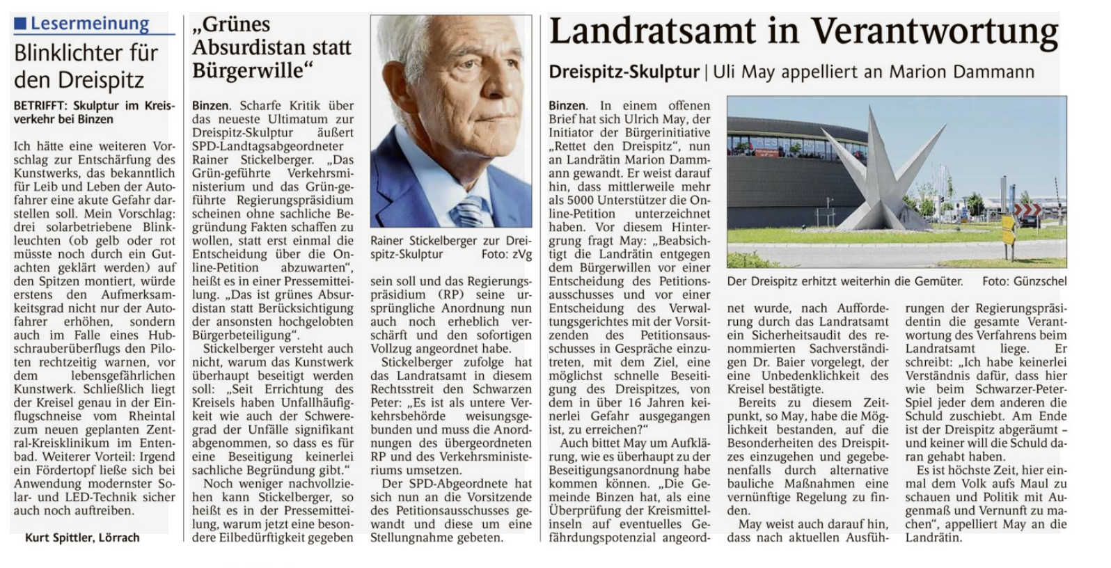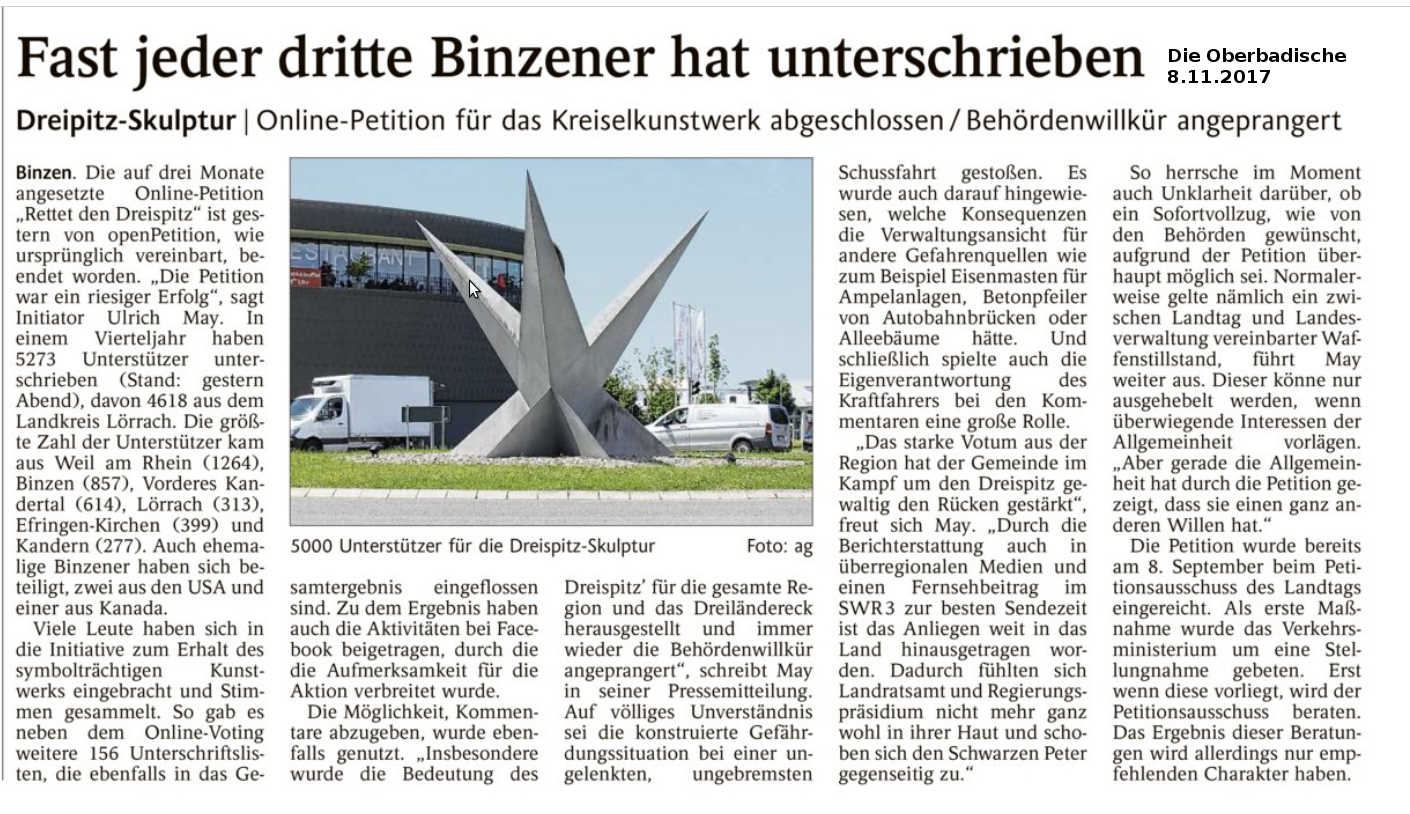 Die Oberbadische 30.11.2017: Dreispitz-Petition: Auschuß macht sich Bild vor Ort. Termin 6.12.2017.