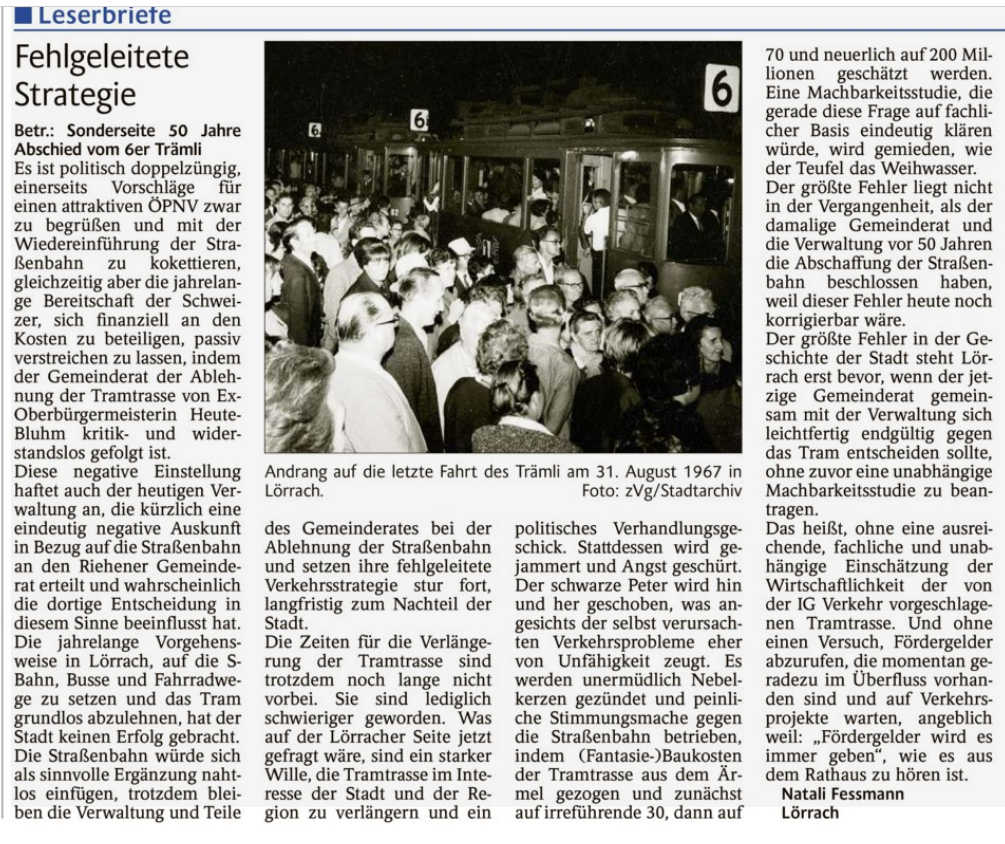OV v. 2.9.2017 N. Fessmann: Fehlgeleitete Strategie. Sonderseite 50 Jahre Abschied vom 6er Trämli.
