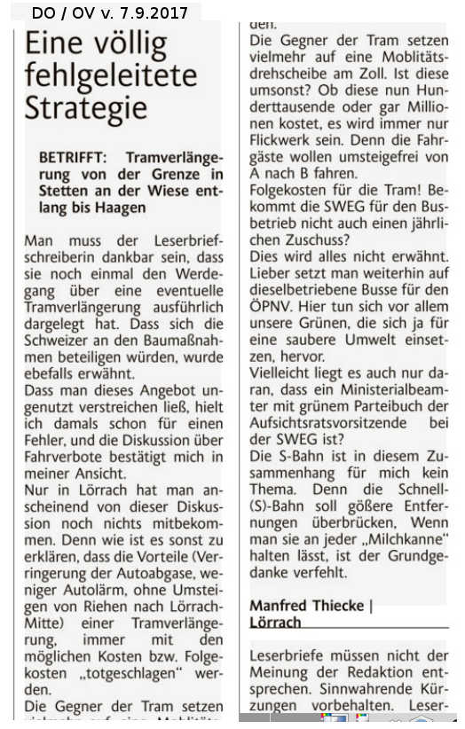 DO/OV v. 7.9.2017 Manfred Thiecke: Tramverlängerung von der Grenze in Stetten bis Haagen.