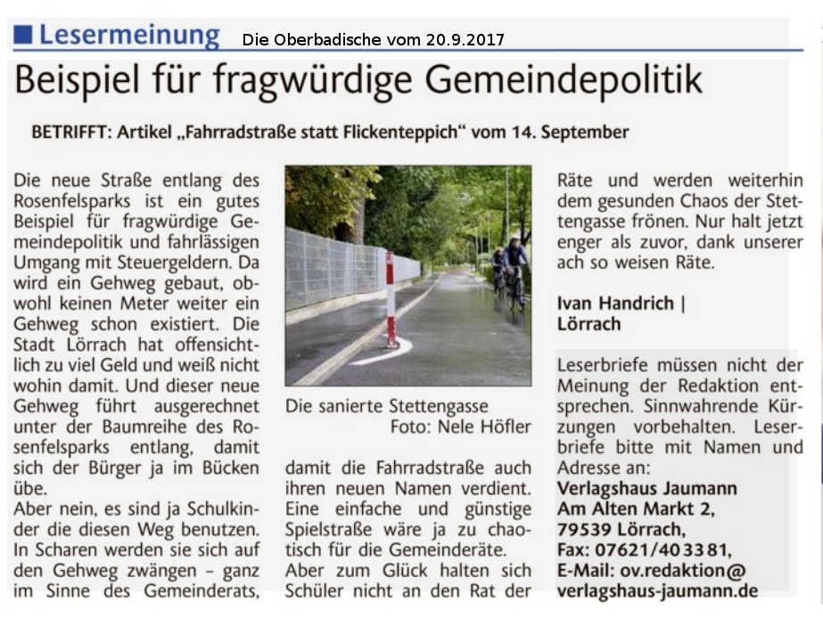 DO/OV v. 20.9.2017 Ivan Handrich: Betrifft: Artikel " Fahrradstraße statt Flickenteppich". Stettengassse - Beispiel für fragwürdige Gemeindepolitik