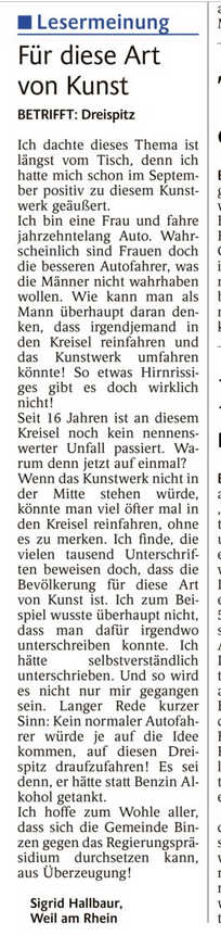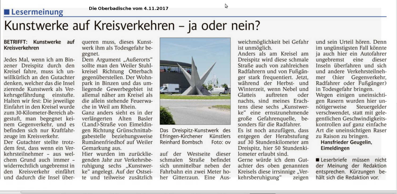 DO/OV v. 4.11.2017, Karlfrieder Geugelin: Dreispitz-Kreisel: Kunst auf Kreisverkehren Ja oder Nein !