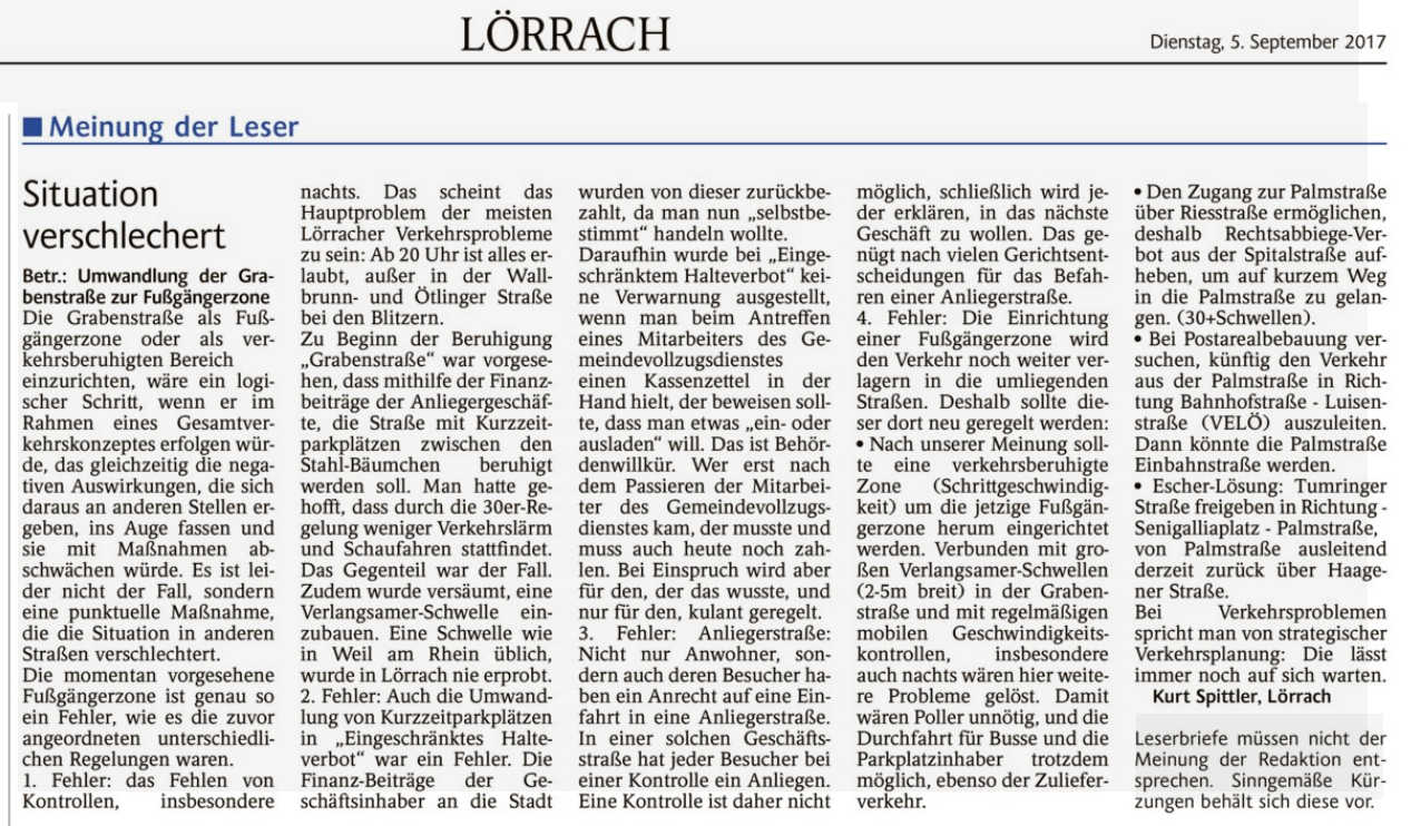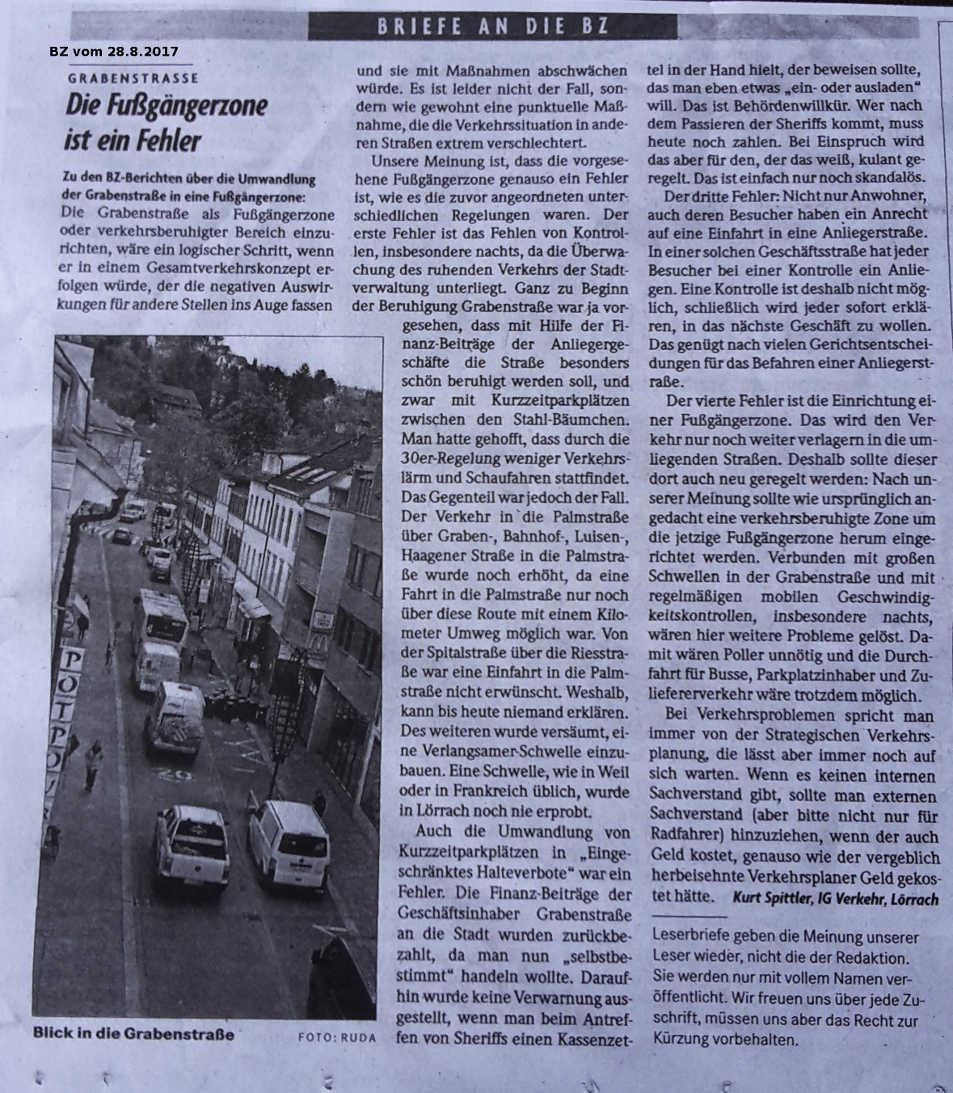 BZ v. 28.8.2017 K.Spittler Lö: Grabenstraße: "Die Fußgängerzone ist ein Fehler", Verkehrsberuhigte Zone wäre bessere Lösung .
