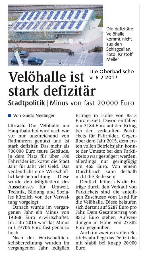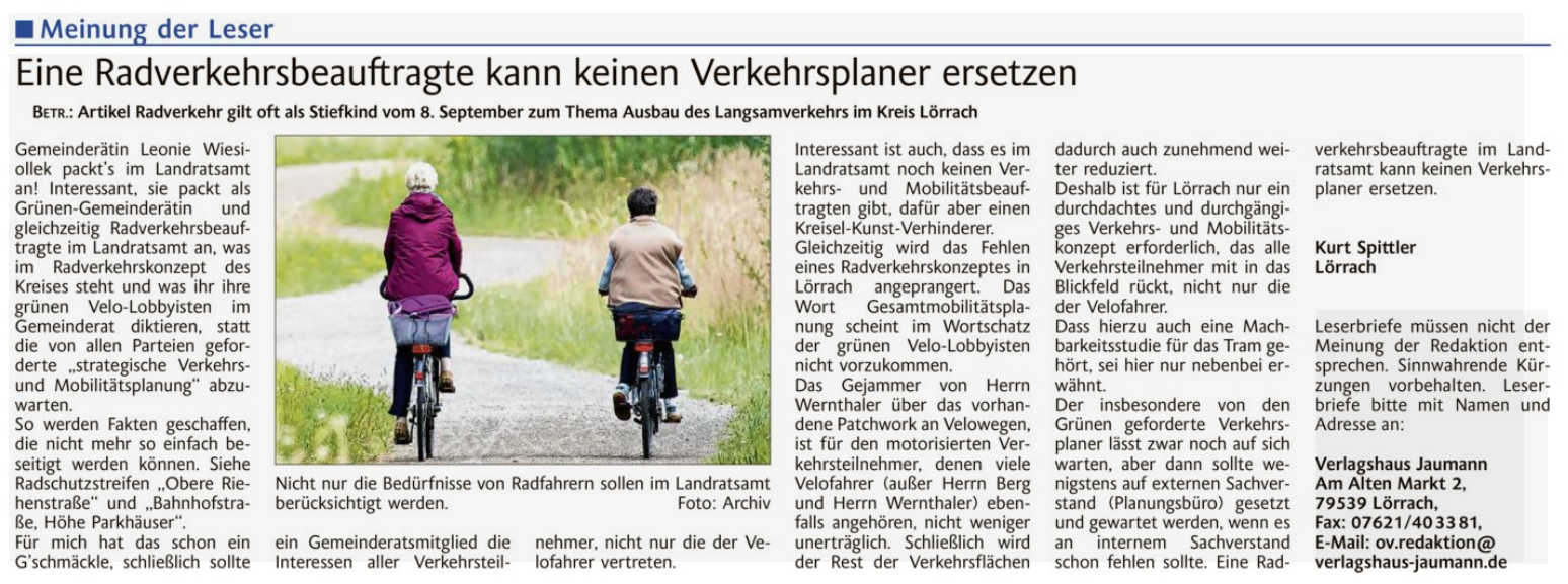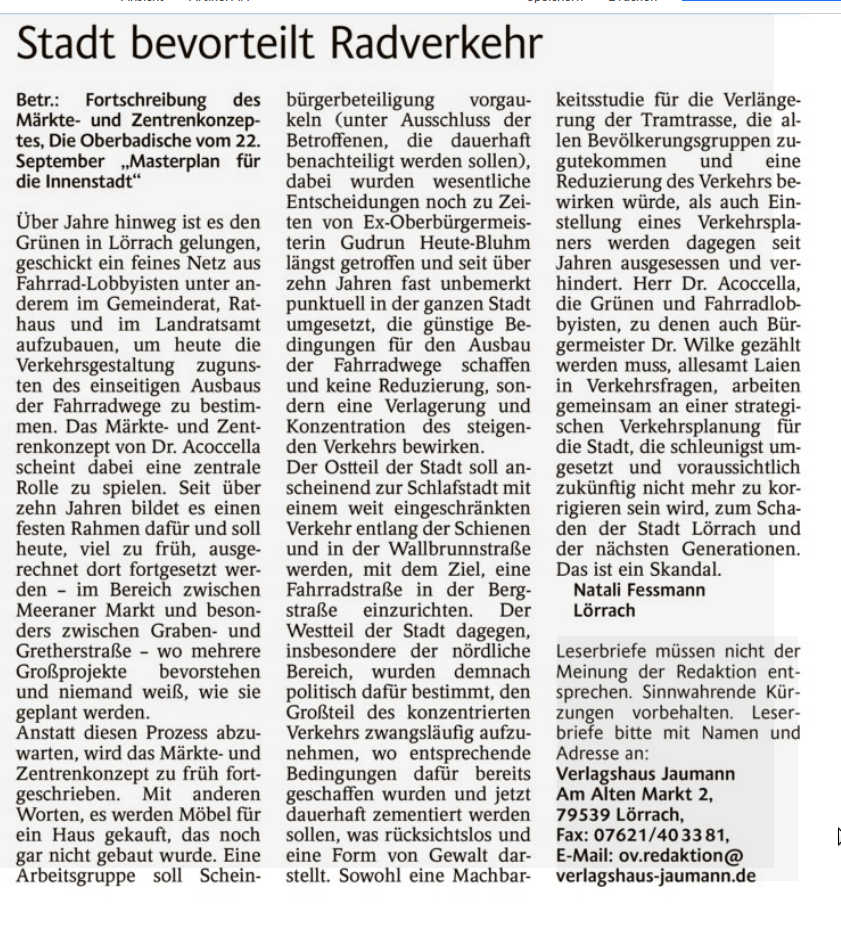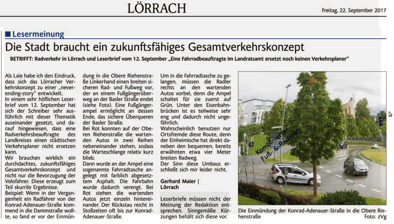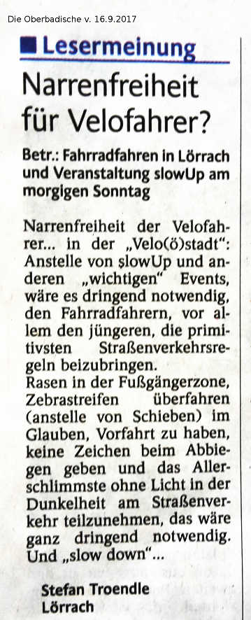 Die Oberbadische 12.1.2017: Offener Brief von B. Escher: Übertrieben fahrradfreundlich...