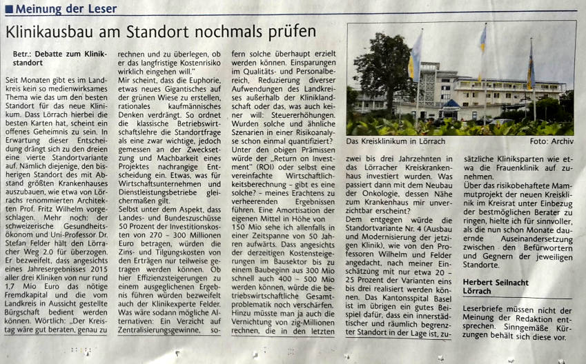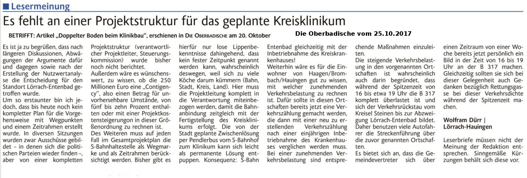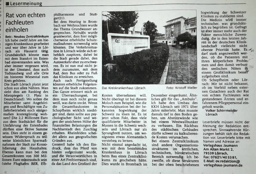 Die Oberbadische 16.2.2017: Zentralklinikum Entenbad Lö: W.Lenz: "Pendelbus zur Klinik eine fasnächtliche Lachnummer"