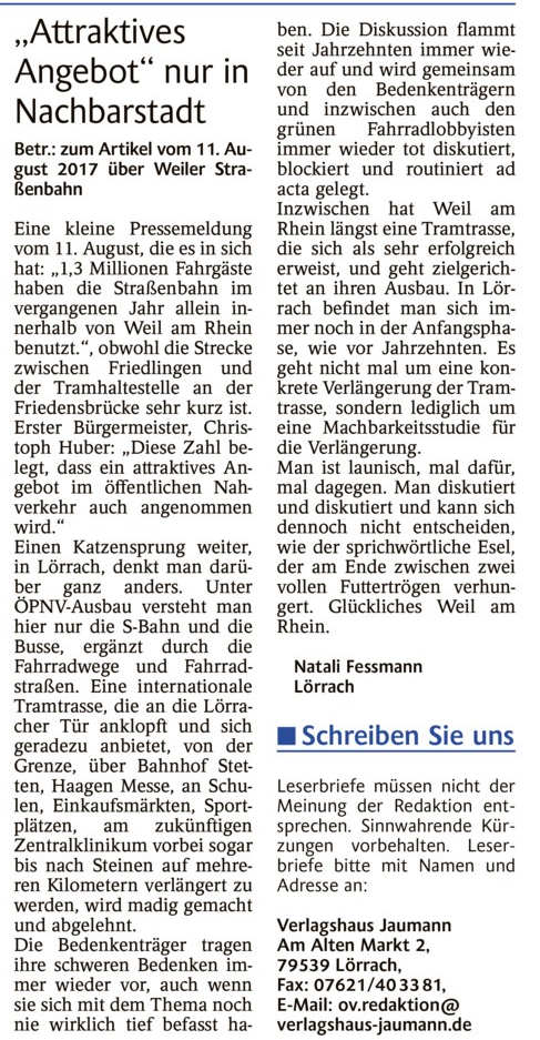 OV. v. 15.8.2017 N.Fessmann: "Attraktives Angebot" nur in der Nachbarstadt nutzen". Weil /Rhein: 1,3Mio Fahrgäste in 1 jahr.