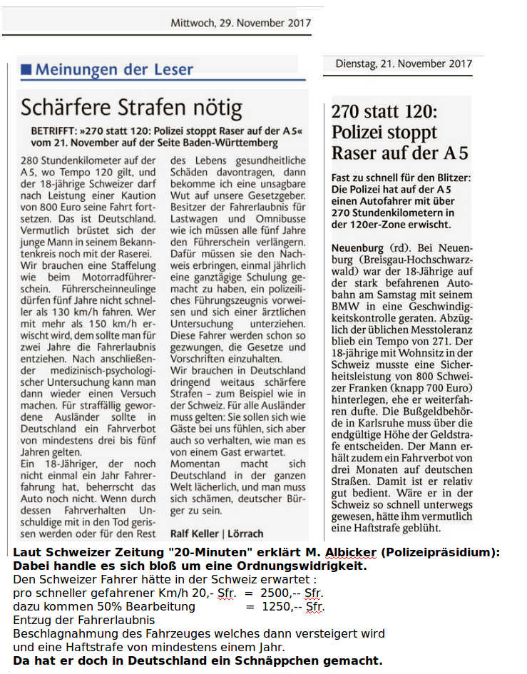 DO/OV v. 29.11.2017, Ralf Keller : Schärfere Strafen nötig! Zur Meldung vom 21.11.2017: Polizei stoppt Raser mit 270kmh auf A5.