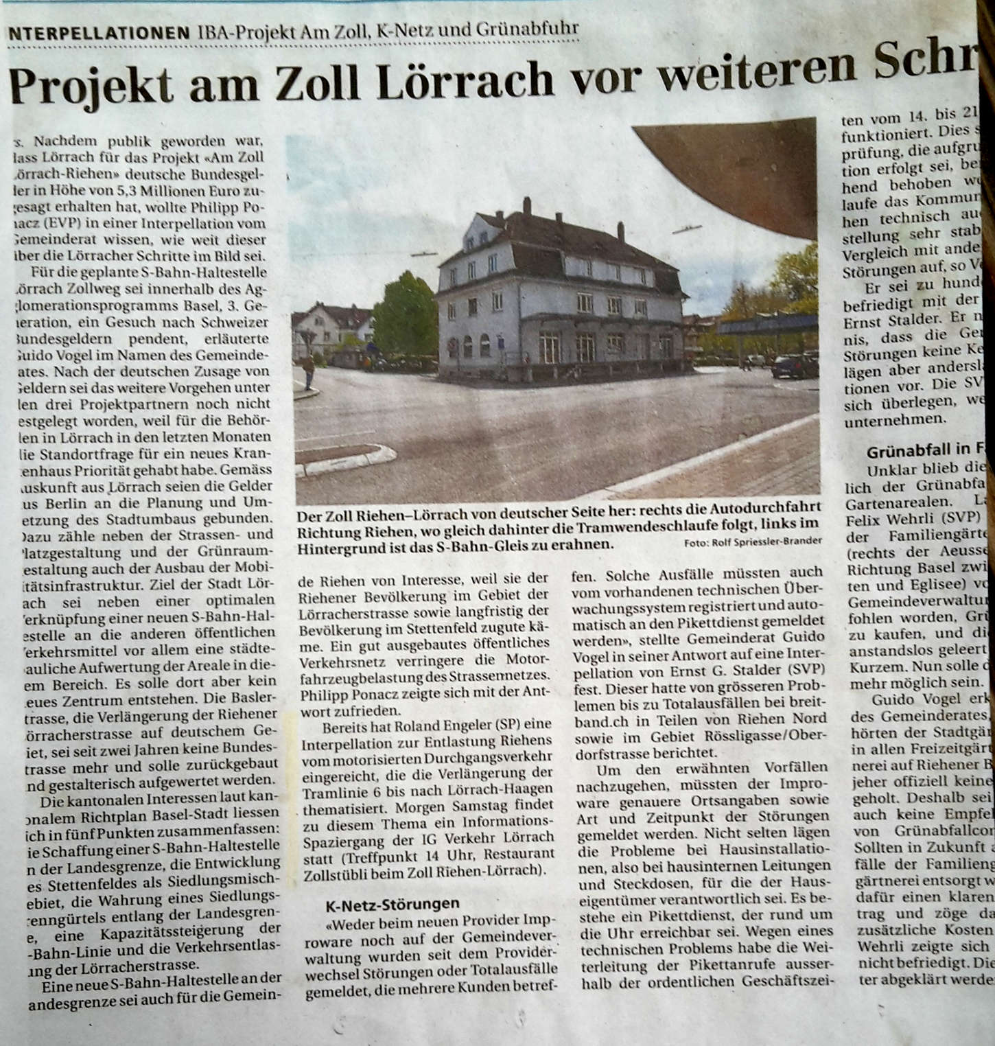 BasellandschZeitg: 12.8.2016: P.Schenk: Neue S-Bahnhaltestelle am Zoll wird kritisiert...aber.... "