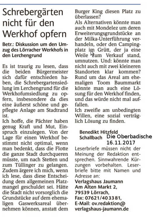 Leserbrief v. 16.11.2017, Benedikt Hitzfeld: Schrebergärten nicht für den Werkhof opfern...