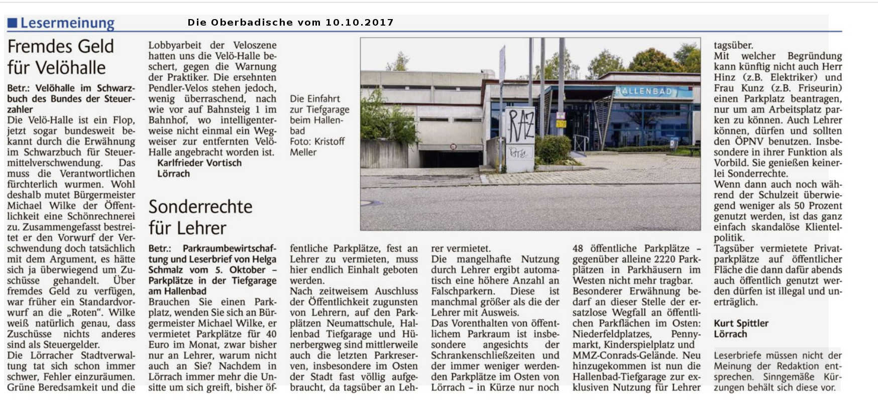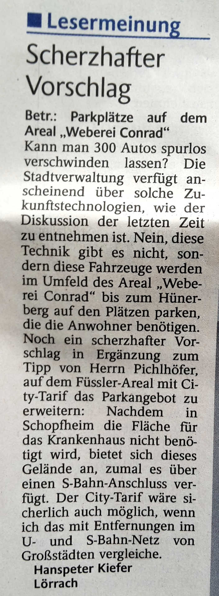 OV. v. 28.4.2017 H.Kiefer: Scherzhafter Vorschlag: Parken auf dem nun freien ZKhausgelände Schopfheim, dann Citytarif nach Lörrach!