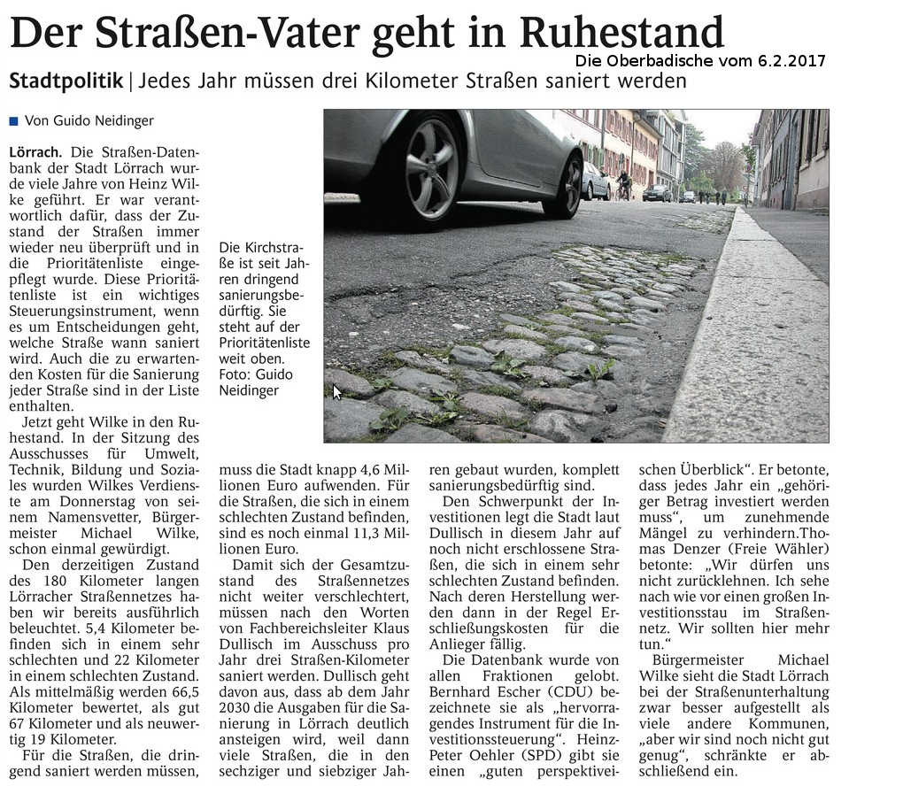 Die Oberbadische 17.3.2017: Lörrachs Strassen haben arg gelitten. ...Der Straßen-Vater geht in den Ruhestand...
