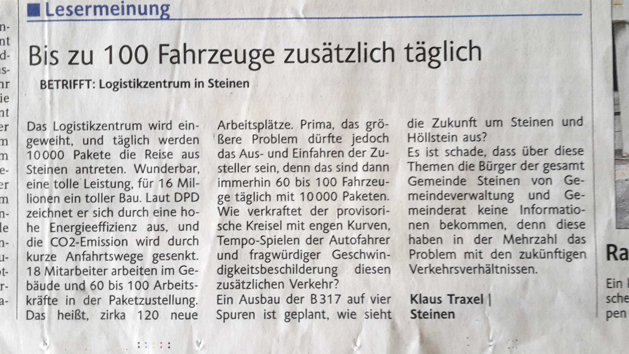 DO/OV v. 7.9.2017 Klaus Traxel: DPD-Logistikzentrum Steinen: Bis zu 100 LKW zusätzlich täglich.