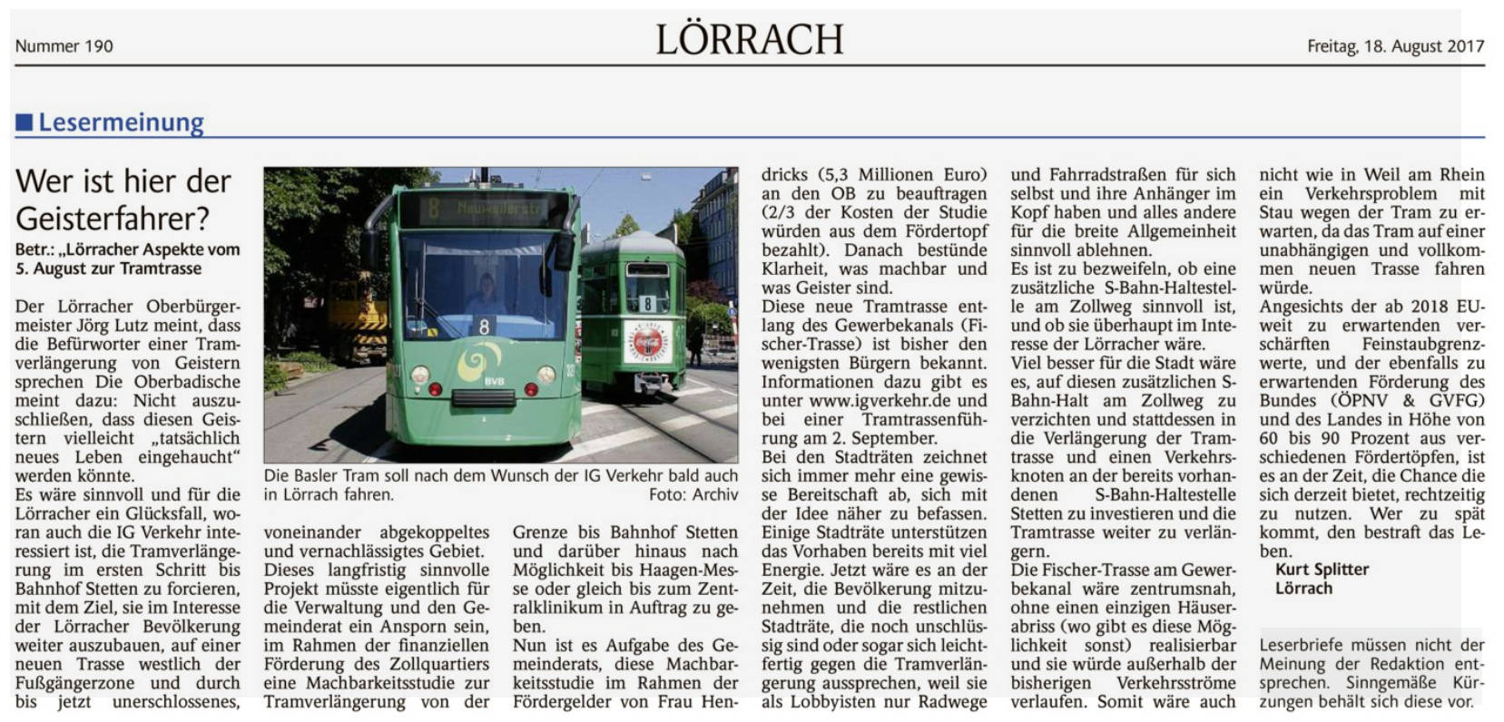 BZ v. 2.9.2017 N.Fessmann: BZ-gekürzte Version: Fehlgeleitete Strategie: Tramverlängerung von der Grenze in Stetten bis Haagen.