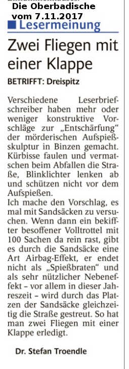 DO/OV v. 4.11.2017, Kurt Spittler: Zum Dreispitz-Kreisel: Blinklichter für den Dreispitz !