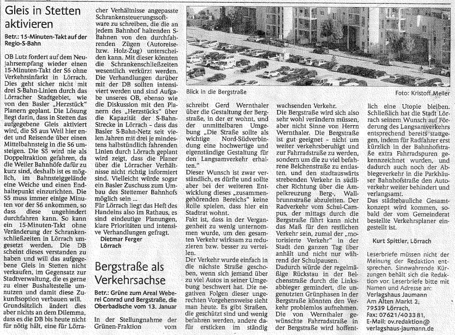 Badische Zeitung 31.1.2017: Verkehrsverbände sprechen mit der Stadt Lörrach über Konzepte.
