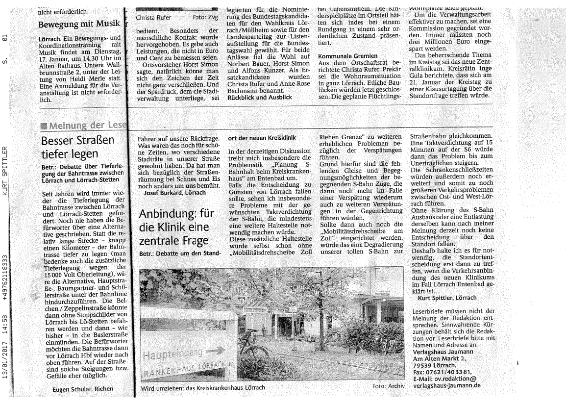 Die Oberbadische 6.1.2017: IG Pro Schiene Dreiland: Klinikstandort Lörrach nur mit Ausbau der Wiesentalbahn