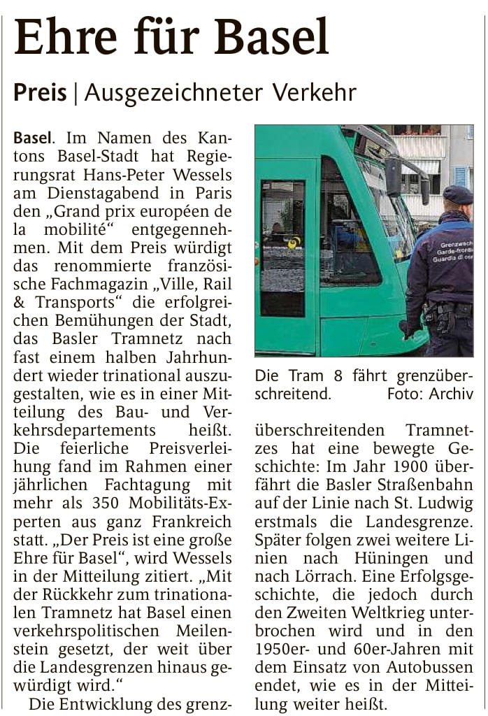 Im Namen des Kantons Basel-Stadt hat Regierungsrat Hans-Peter Wessels in Paris den "Grand prix européen de la mobilité" für die erfolgreichen Bemühungen Basels, sein Tramnetz nach fast einem halben Jahrhundert wieder trinational auszugestalten überreicht bekommen. (BZ 06.12.2018)